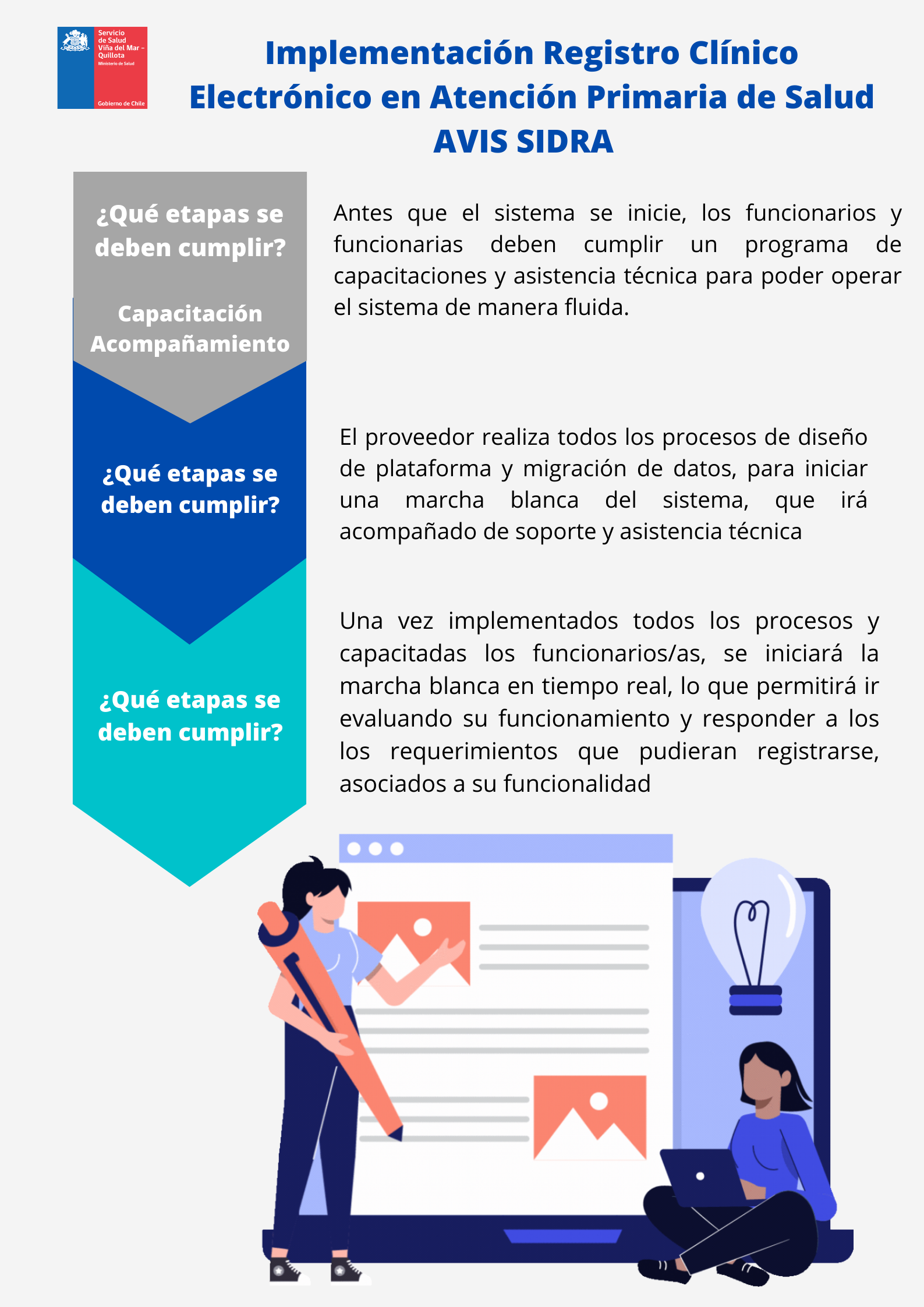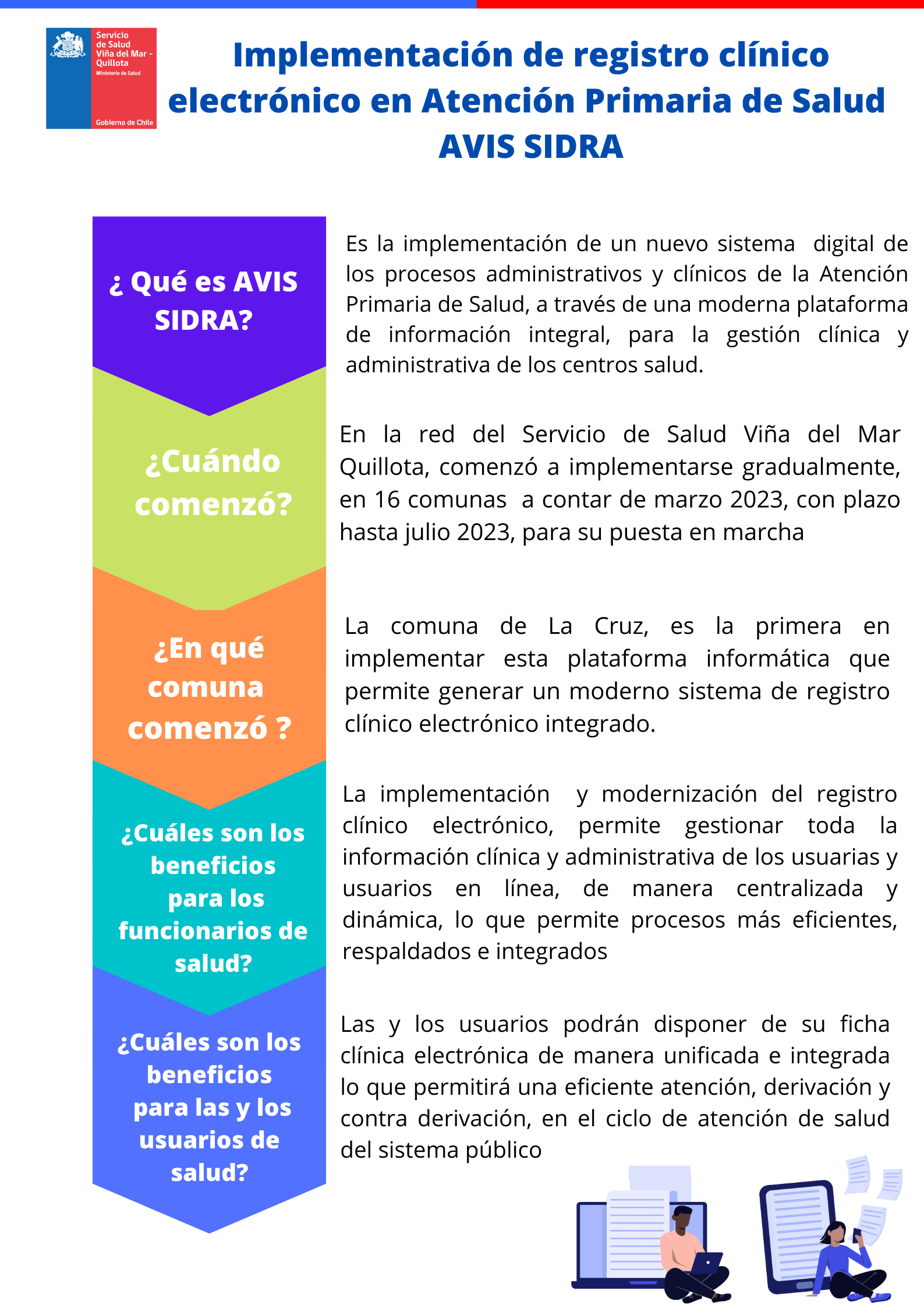 Les invitamos a informarse sobre el gran cambio que significará la aplicación de la nueva plataforma AVIS SIDRA en las 18 comunas de nuestra red asistencial, este proceso de implementación ya comenzó en forma inicial en la comuna de La Cruz, que es la única comuna que pasa de la ficha clínica en papel a ficha clínica electrónica, para posteriormente, avanzar en las próximas comunas que inicialmente son: Concón, Quintero, Puchuncaví, Zapallar y Papudo hasta completar finalmente 16 comunas y en total más de 56 dispositivos de salud, lo que constituirá un enorme desafío tecnológico y humano.