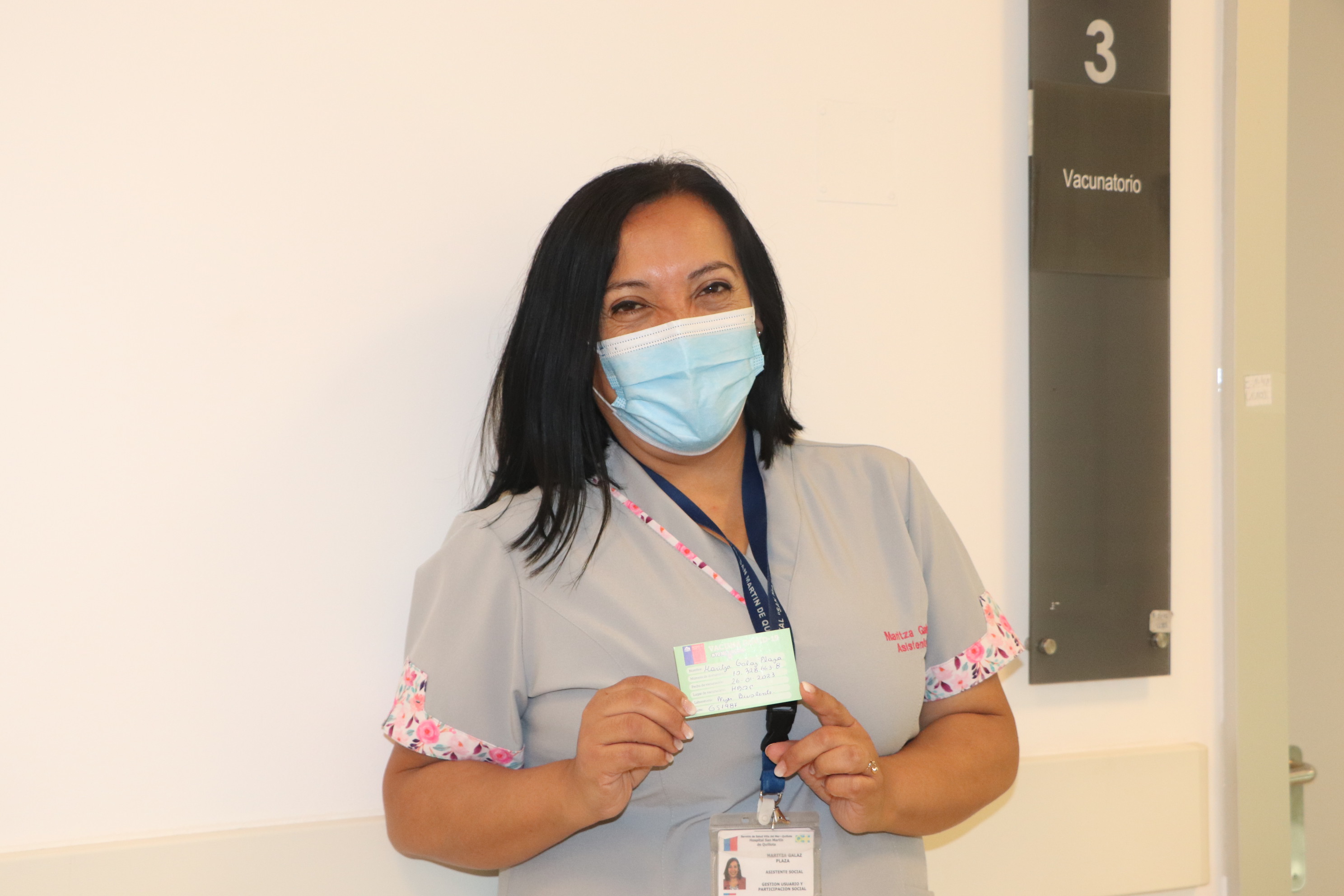 Ana Lillo Reinoso, TENS del Consultorio de Especialidades, dirigente de la Fenats y Presidenta del Comité Paritario de nuestro establecimiento también nos entregó su mensaje respecto de este proceso de vacunación que beneficia al personal hospitalario. “Llevo 26 años de servicio, siempre con pacientes, y obvio que me gusta cuidarme para poder brindar una buena atención. Entonces yo los invito a todos a que se vacunen, porque es muy importante estar protegidos, sobre todo de este virus que es muy dañino, y tenemos la facilidad en el Hospital que tenemos un Vacunatorio exclusivo para funcionarios”