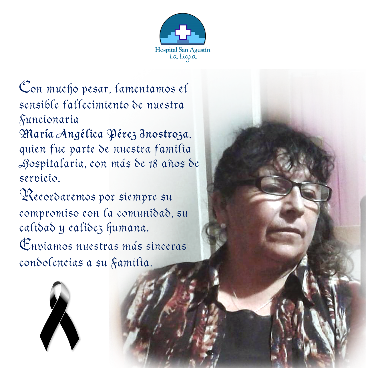 Con profundo pesar, la comunidad funcionaria del Hospital San Agustín de La Ligua, lamenta el sensible fallecimiento de la señora María Angélica Pérez Inostroza, destacada funcionaria, quien por más de 18 años trabajó en las dependencias del centro asistencial.