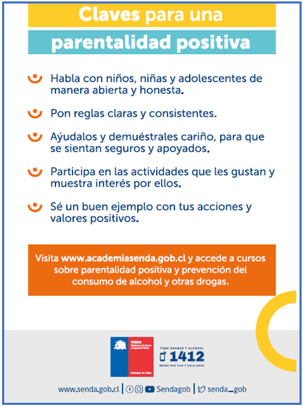 Este año SENDA, Servicio Nacional para la Prevención y Rehabilitación del Consumo de Drogas y Alcohol, busca enfatizar la importancia del trabajo en equipo y la participación de todos/as los/as adultos de la comunidad en la prevención del consumo de drogas en los/as niños, niñas y adolescentes. Por lo tanto, como comunidad funcionaria podemos contribuir en el objetivo de generar conciencia sobre la importancia de la parentalidad social y el papel que juega toda la comunidad de adultos en la tarea de prevenir el consumo de drogas.