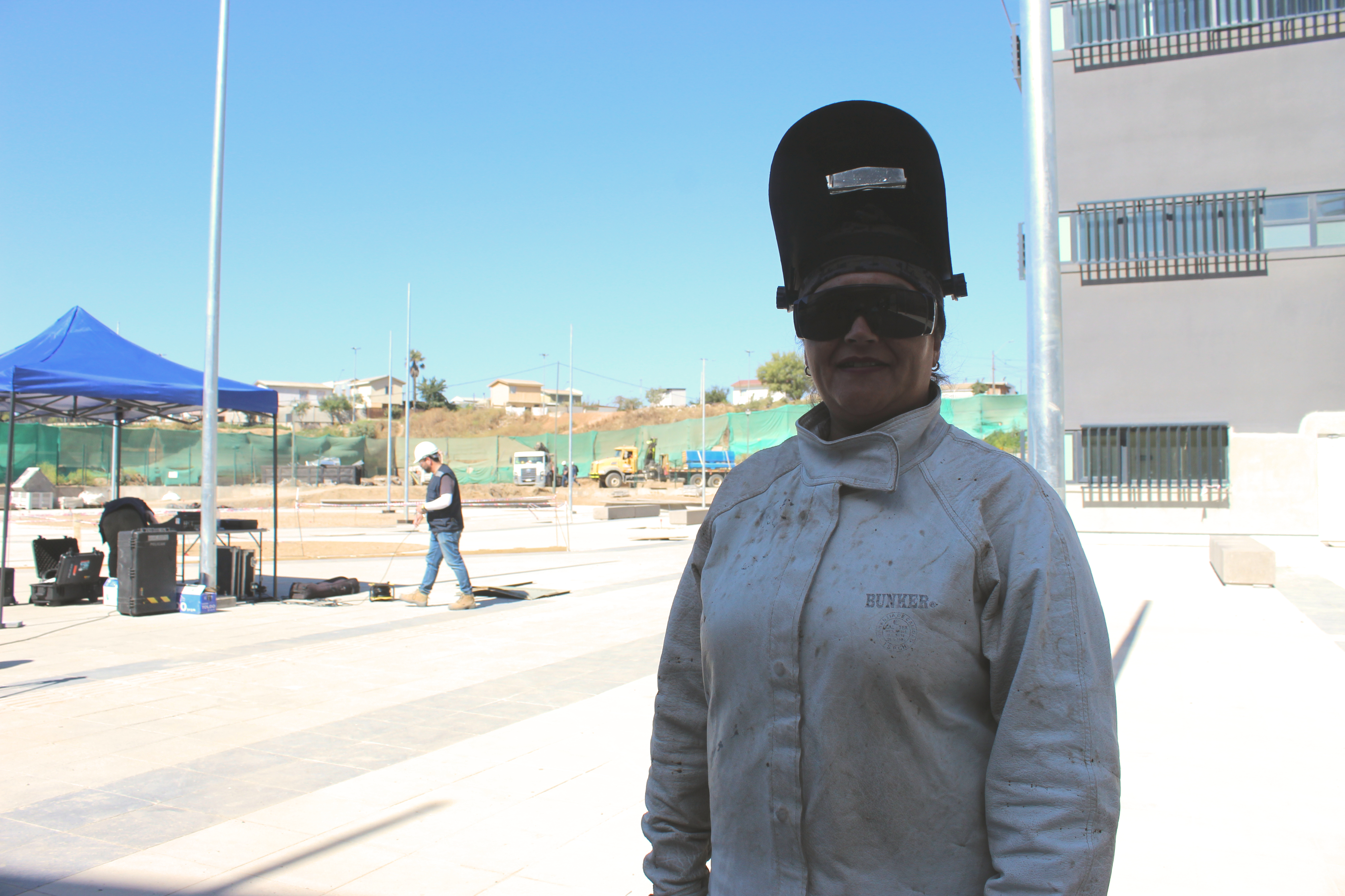 Claudia Silva, ayudante de soldadora “es una bonita experiencia, ahora comprendemos también a los hombres cuando llegan de la construcción, es pesado, sacrificado pero estamos todas dándole, aprendiendo para terminar el proyecto. Siempre me llamó la atención y se dio la oportunidad y la proveché altiro (ser soldadora)”