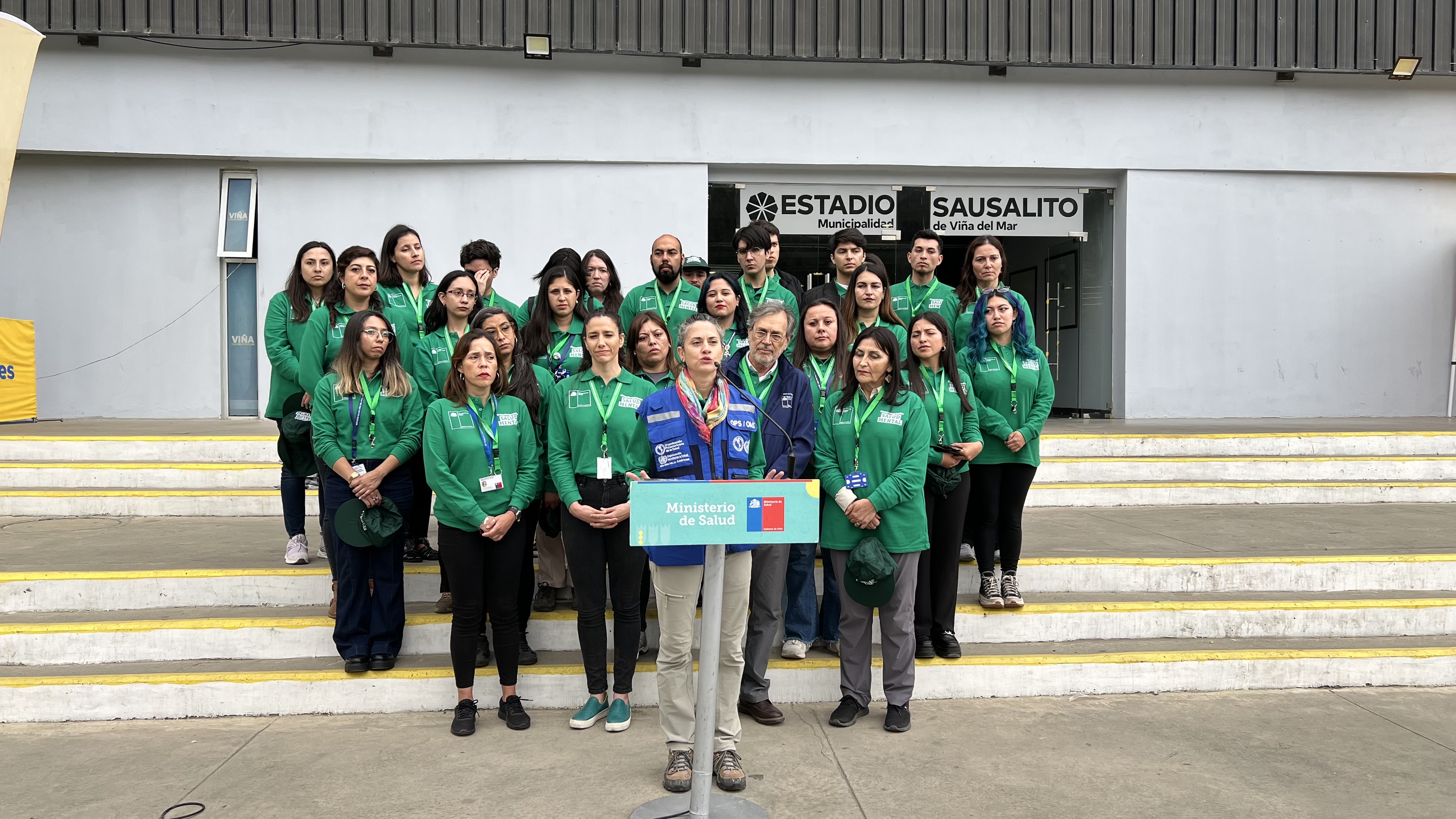 La Ministra de Salud (s), Andrea Albagli, junto al Subsecretario de Redes Asistenciales, Osvaldo Salgado; la Seremi de Salud, Lorena Cofré; y la Directora del Servicio de Salud Viña del Mar Quillota Petorca, Andrea Quiero, llegaron hasta el estadio Sausalito de Viña del Mar, para reconocer a los equipos y constatar el progresivo aumento de apoyo en salud mental que se está entregando desde el inicio de la emergencia.