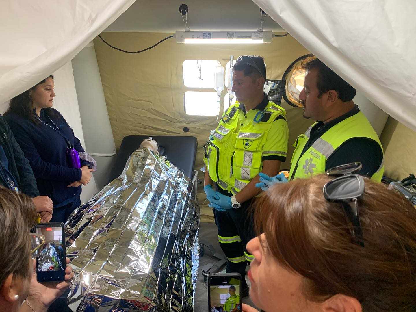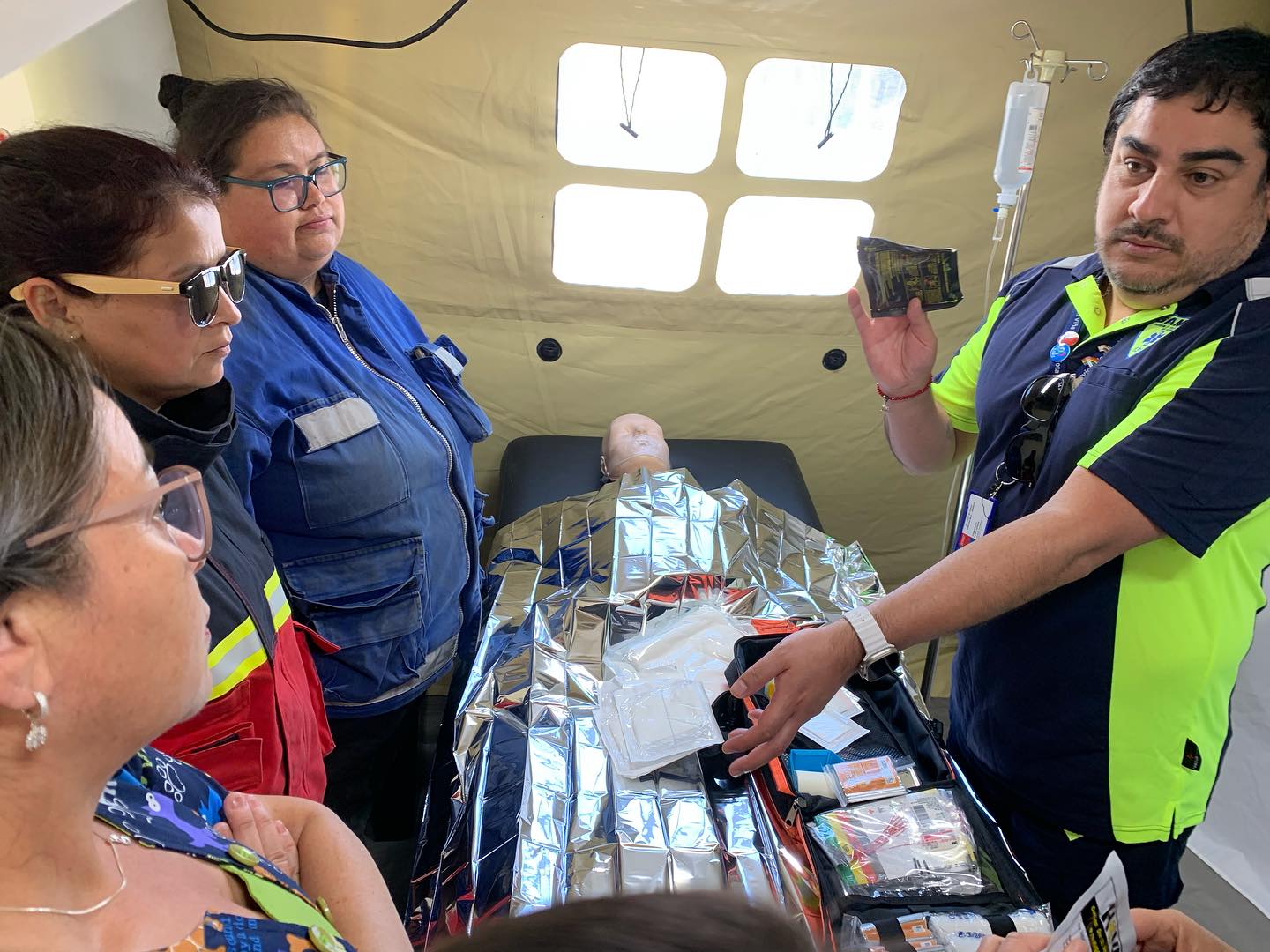 A su vez, la Dra. Teresa Desenzani, Directora (s) del SAMU SSVQ, se refirió a la complejidad de la atención que posee el Puesto Médico Avanzado o PMA,  “La principal función en un principio, fue capacitar a nuestro personal de la Base La Ligua en que supieran el armado del Puesto Médico Avanzado.  Esto es de suma importancia, ya que cuando se arma, es necesario tener personal idóneo que sepa dónde se ponen las cosas y de dónde se sacan los equipamientos. Nosotros tenemos dos carpas, en una de ellas se puede hacer un COGRID (Comité de Gestión del Riesgo de Desastres), se puede establecer un Puesto de Mando y también tenemos toda el área clínica, donde se pueden establecer distintos boxes de atención para atender pacientes de distintas complejidades.  Les mostramos cómo acá nosotros podemos montar salas de reanimación con altísimo estándar, podemos trabajar con pacientes desde triage (categorización) rojo, es decir, pacientes muy graves, hasta pacientes más básicos”.