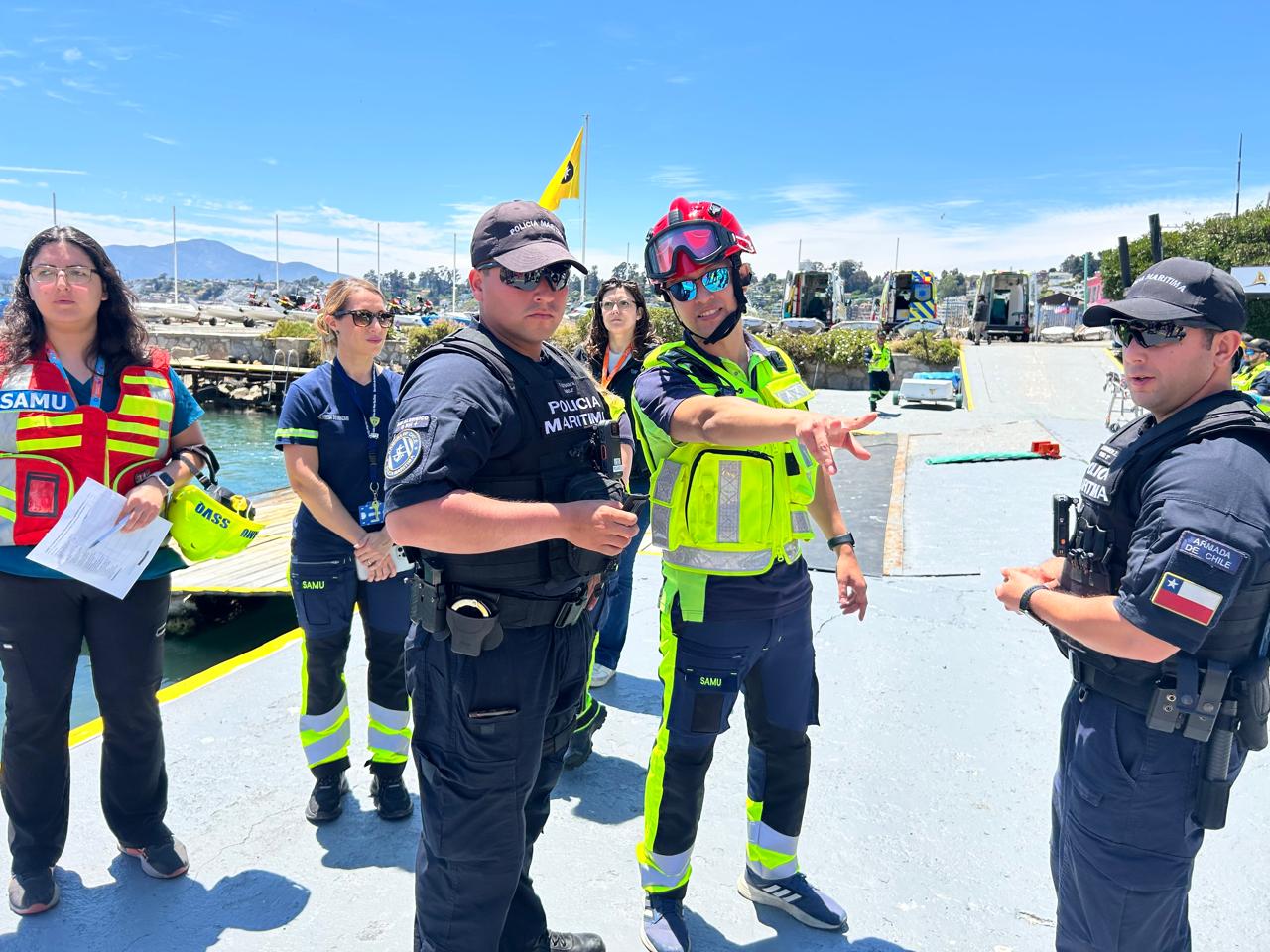 El ejercicio recreó la caída de varias personas desde una embarcación, activando de inmediato al Sistema de Atención Médica de Urgencia (SAMU), unidades marítimas de la Armada, personal municipal y equipos de primera respuesta. La actividad permitió poner a prueba los tiempos de reacción, la coordinación intersectorial, el traslado de pacientes simulados y su derivación final a un centro asistencial. Ejercicio que se enmarcó en el lanzamiento de la Campaña Verano en nuestras costas.
