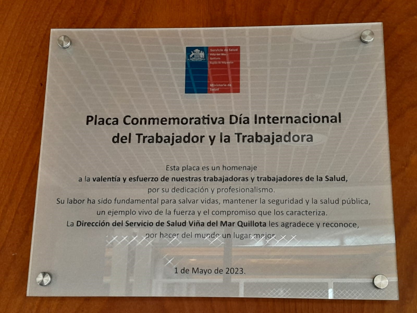 Con la presencia de directivos, dirigentes gremiales, y representantes de todos los estamentos del Hospital Dr. Gustavo Fricke, la Directora del Servicio de Salud Viña del Mar Quillota, Andrea Quiero Gemli, descubrió una placa de homenaje a los trabajadores y trabajadoras de la Salud en el marco del Día Internacional del Trabajo.